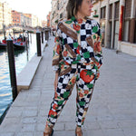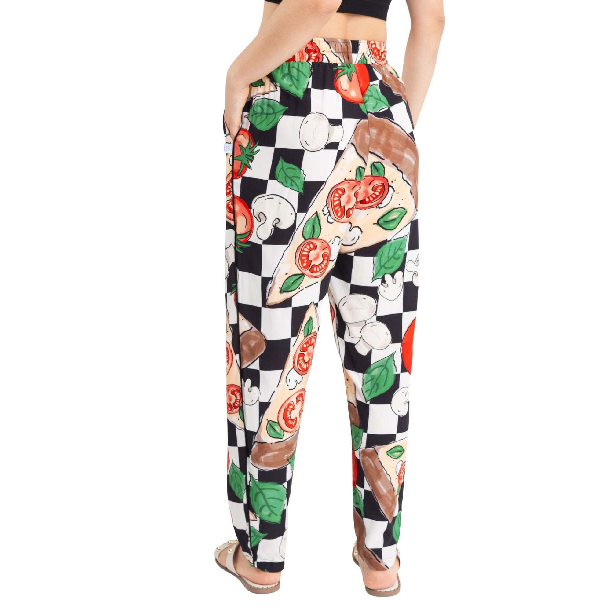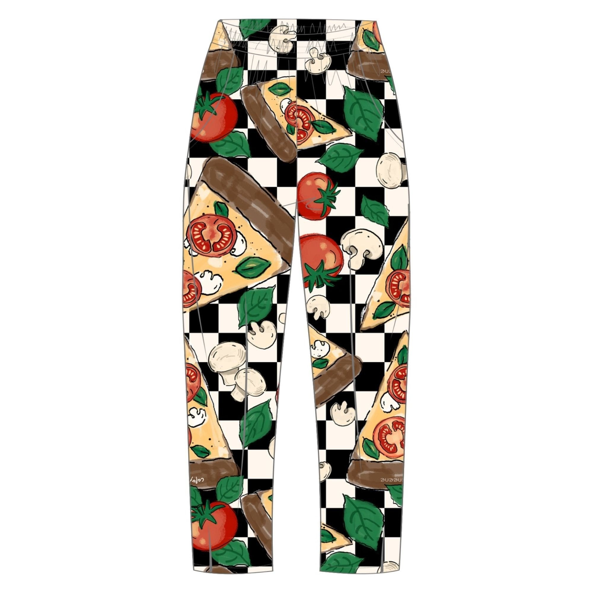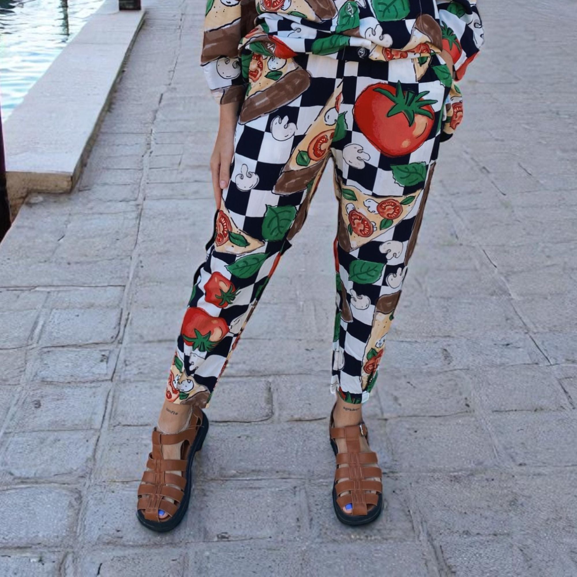 A calça com prega da coleção Pizza é o tipo de peça que muda o humor do look inteiro. Com modelagem clássica de alfaiataria — cintura alta, pregas marcadas e caimento reto — ela brinca com o inesperado ao trazer uma estampa gráfica irreverente que combina fatias de pizza, símbolos pop e pitadas de ironia visual.